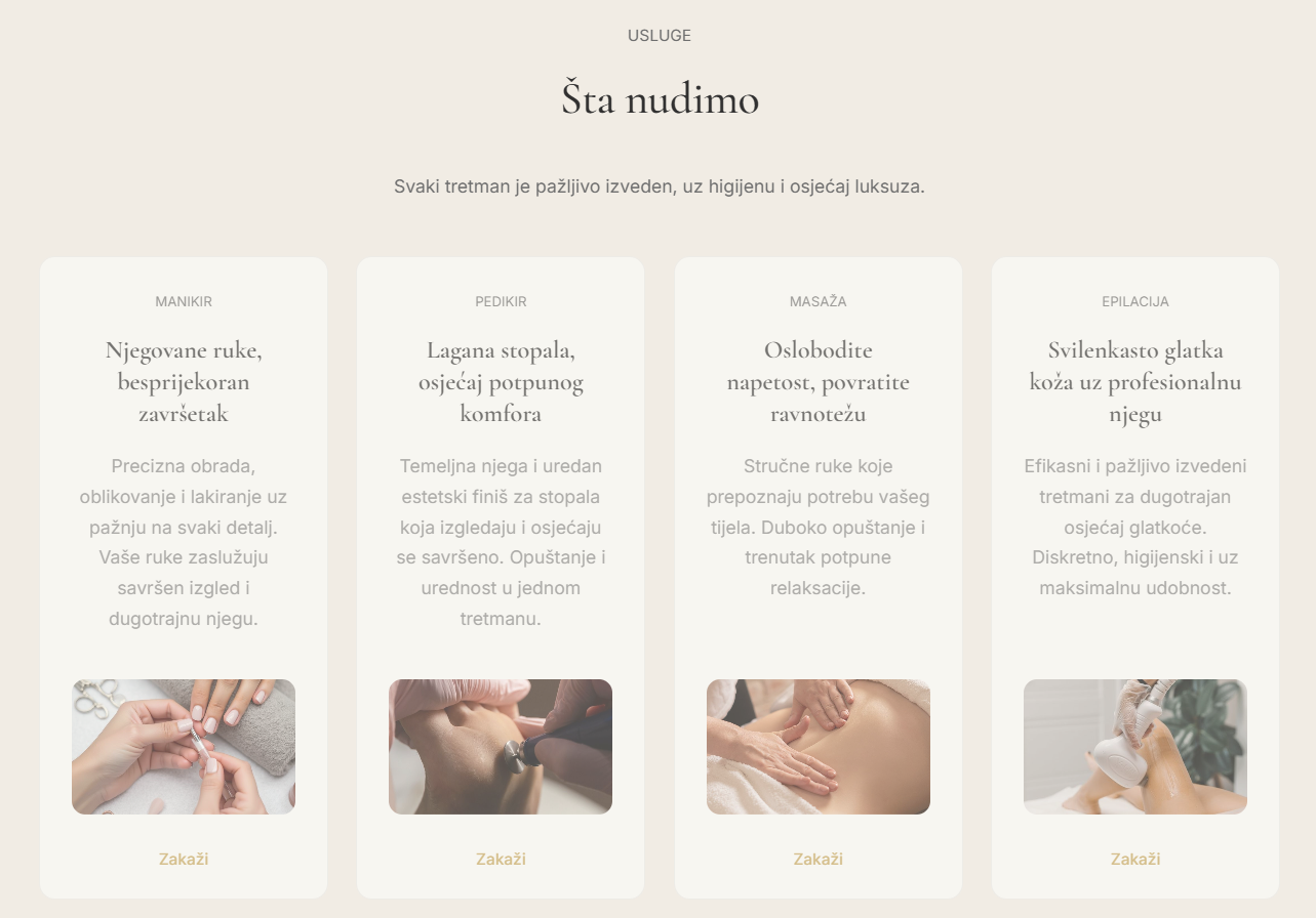 Beauty Studio AS is a boutique landing page designed and developed for a beauty salon based in Podgorica. The goal of the project was to create a refined, minimal digital presence that reflects the salon’s premium atmosphere while clearly presenting its services and encouraging bookings. The focus was on combining elegant visual design with a structured layout that guides users naturally from first impression to action.